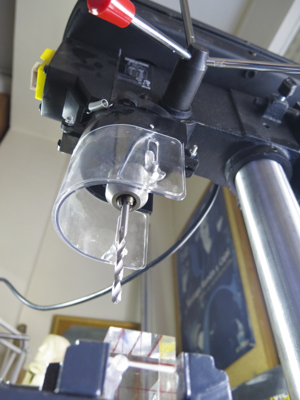Un taladro de columna, anque sea de un Centro comercial, se hace necesario para obtener perforaciones perpendiculares. Primeramente efectuamos con centro en la intersección de la ranura más externa con la que encaja en el traste, un taladro de 4 mm, bien centrado y recto hasta la superficie superior. Pasamos brocas de 5 y acabamos con 6mm. En la parte superior agrandamos secuencialmente, una zona de 17 mm , de la forma más concéntrica posible hasta llegar a broca de 8mm.